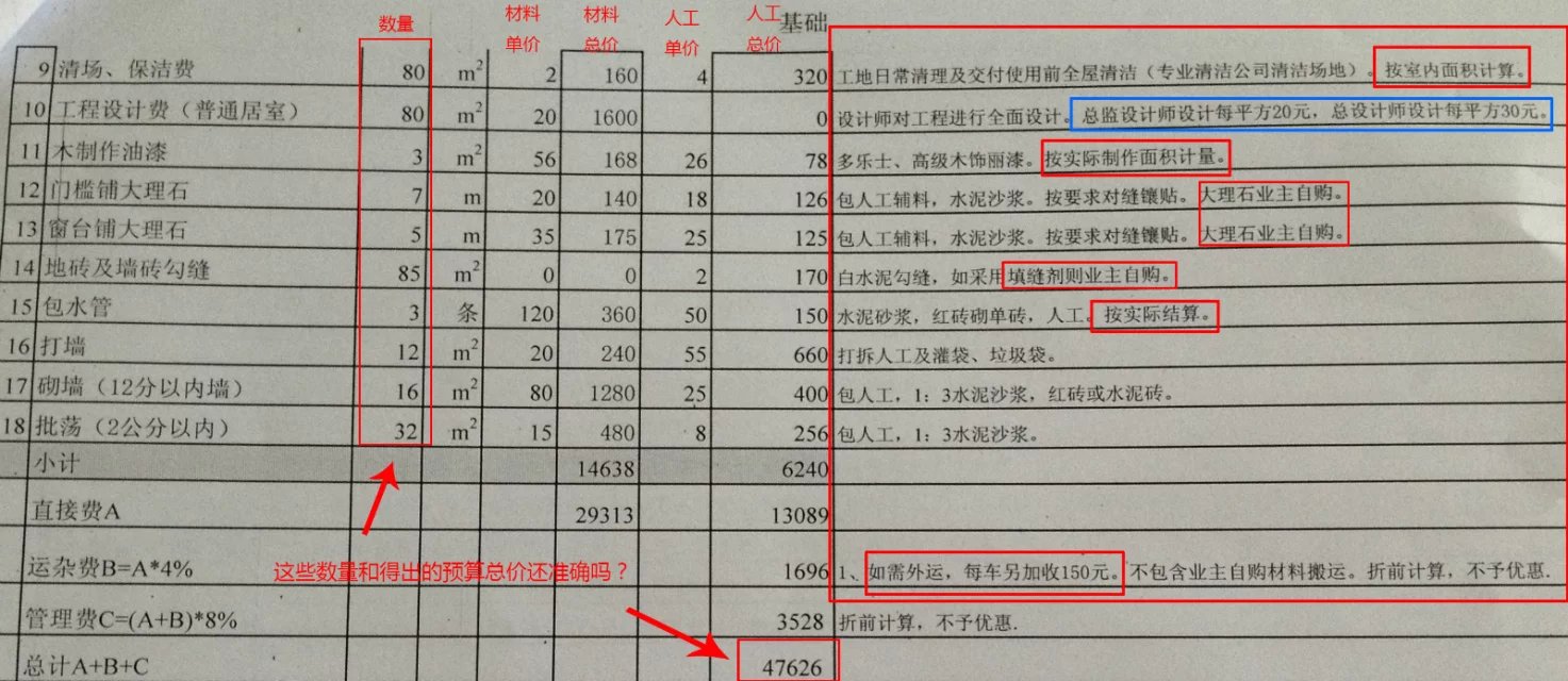 第二,備注里有很多價錢說明。最后業(yè)主的結(jié)算會高于預(yù)算總價。